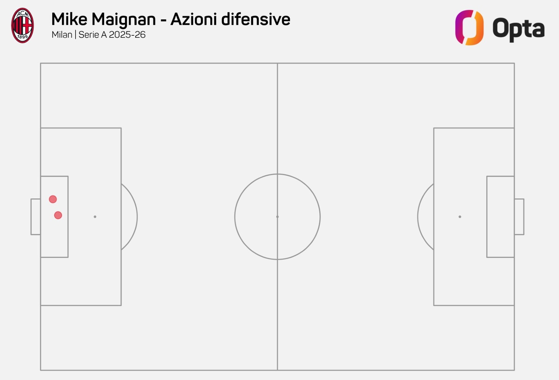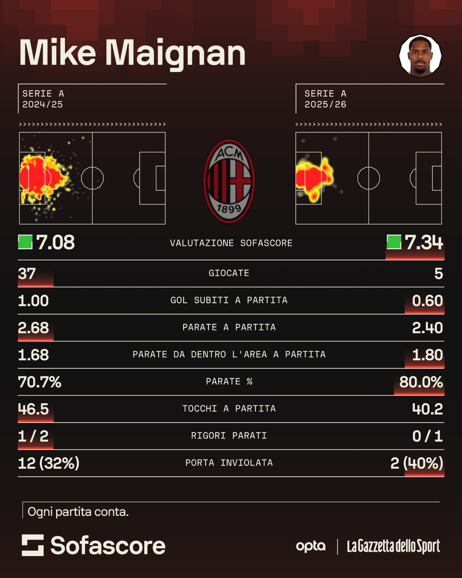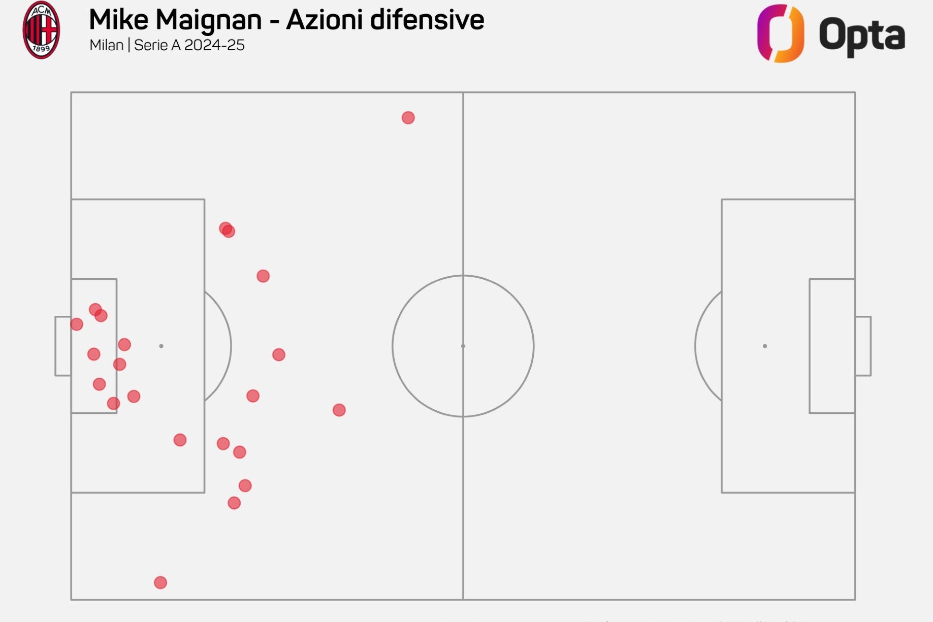 另一个数据表明,阿莱格里改变了迈尼昂的风格,对他的出击次数进行了重新要求。迈尼昂在本赛季场均出击1.6次,是在丰塞卡和孔塞桑执教时(0.57次)的三倍。其他方面的需求,尤其是与丰塞卡时代相比,已经发生了变化。米兰现在防守更加紧凑,迈尼昂面临更多的传中球。显而易见,这种改变对他有好处,迈尼昂失球更少了。他的扑救次数也有所下降,从每场2.7次降至2.4次,这是因为米兰面临的射门次数减少了。