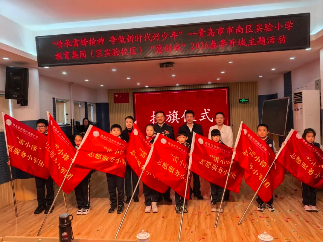 在青岛市市南区实验小学教育集团(区实验校区)开学第一课大思政教育活动中,校长朱雪梅为少先队员们送上新学期的成长寄语,鼓励大家以雷锋精神为成长指引,在新学期笃行不怠、向阳生长,用实际行动践行新时代少先队员的责任与担当。现场,市南区星河志愿队与学校结对,为少先队员代表授予“雷小锋志愿服务小军团”旗帜,为队员们搭建起更广阔的志愿服务实践平台。