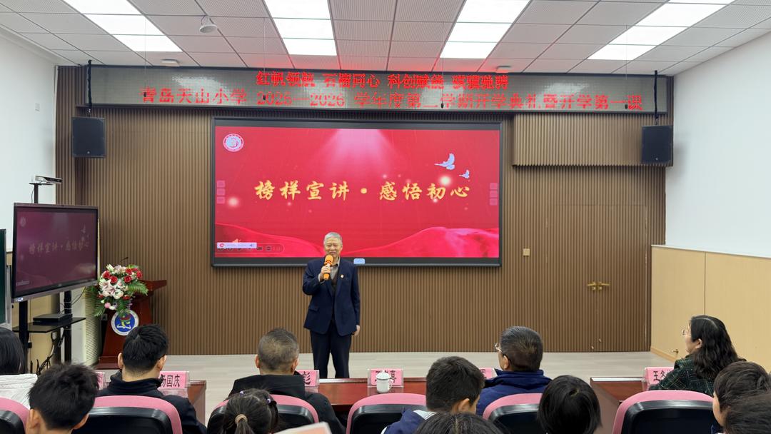 3月5日恰逢学雷锋纪念日,青岛天山小学以“传承雷锋精神,争做新时代好少年”为主题,举行2026年春季学期开学典礼暨开学第一课活动。作为大中小学思政一体化建设的重要实践,学校自去年启动“天山‘雷小锋’在行动”主题活动以来,携手青岛大学大学生志愿者,让志愿精神在校园落地生根。活动当天,学校特别邀请青岛市劳动模范、海尔集团原委副、青岛市红色文化研究会红色基因研究顾问王安喜结合鲜活事迹,为同学们讲述雷锋精神,诠释雷锋精神的时代内涵,让红色精神根植童心。王安喜还为学校捐赠了《传承红色基因教育——青少年读本》,让红色书香浸润校园,为学子成长注入红色动力。